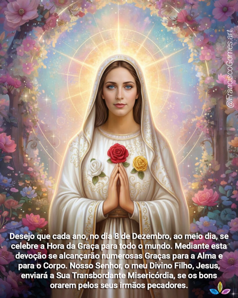 Desejo que cada ano, no dia 8 de Dezembro, ao meio dia, se celebre a Hora da Graça para todo o mundo. Mediante esta devoção se alcançarão numerosas Graças para a Alma e para o Corpo. Nosso Senhor, o meu Divino Filho, Jesus, enviará a Sua Transbordante Misericórdia, se os bons orarem pelos seus irmãos pecadores.